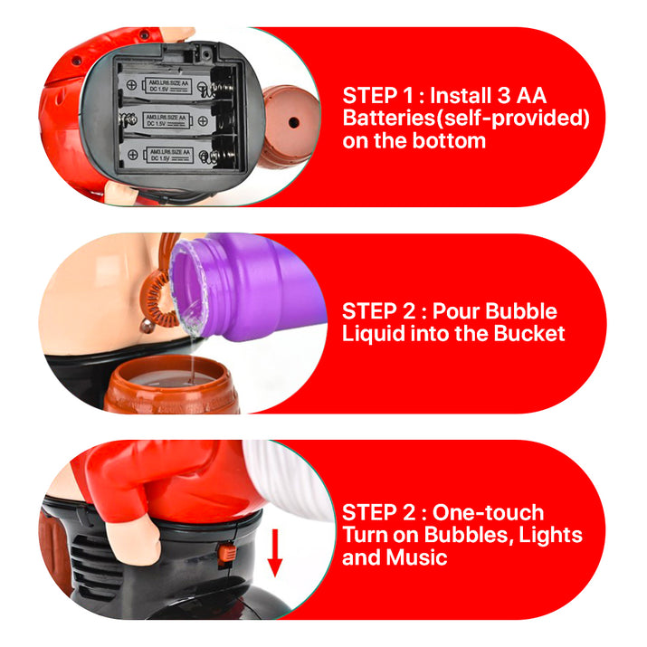 Answer 1: The bubble blower operates with a simple button press that activates both the bubble production and the humorous fart sounds along with festive music, creating an entertaining atmosphere filled with floating bubbles.